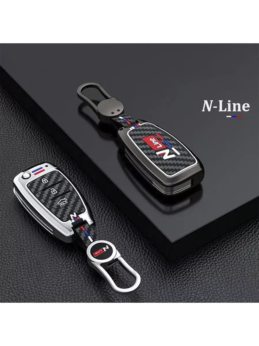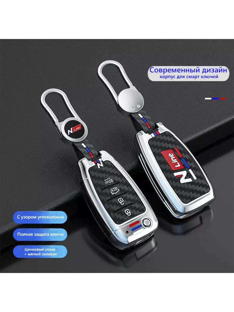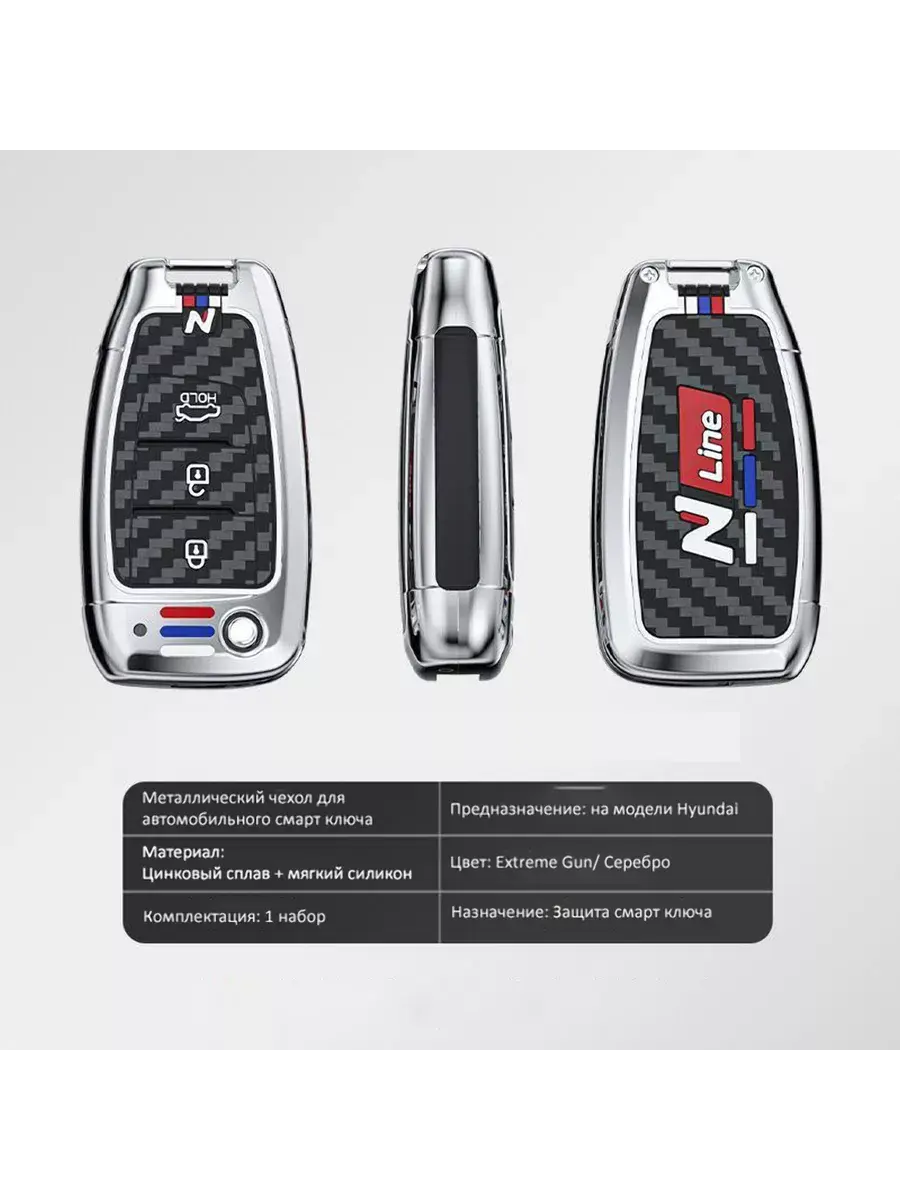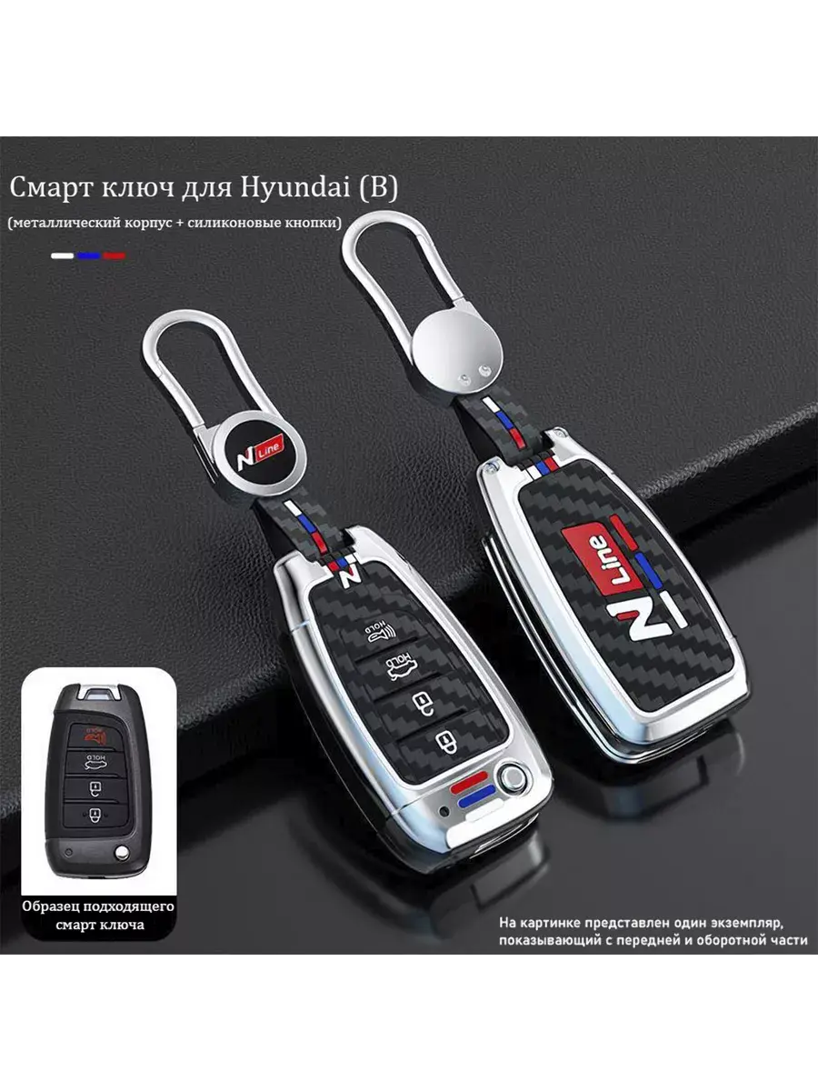 Металлический чехол для автомобильного ключа Hyundai Elantra, i30, Creta, Bayon, i20 и новые модели с 2022 года в стиле N-Line 4 кнопочный (ОБРАЗЕЦ НА ПЕРВОМ РИСУНКЕ). Удобный, стильный, прочный чехол из высококачественного корпуса для автомобильного SMART ключа марки Hyundai с вырезом под логотип. Светящаяся трехцветная резиновая полоска. Лаконичный стиль, яркий цвет, такой чехол предотвратит появление царапин и повреждений на ключе Вашего любимого автомобиля. Защищает от пыли. Для марки автомобиля: Hyundai. Материал: кожа, цинковый сплав, силикон.