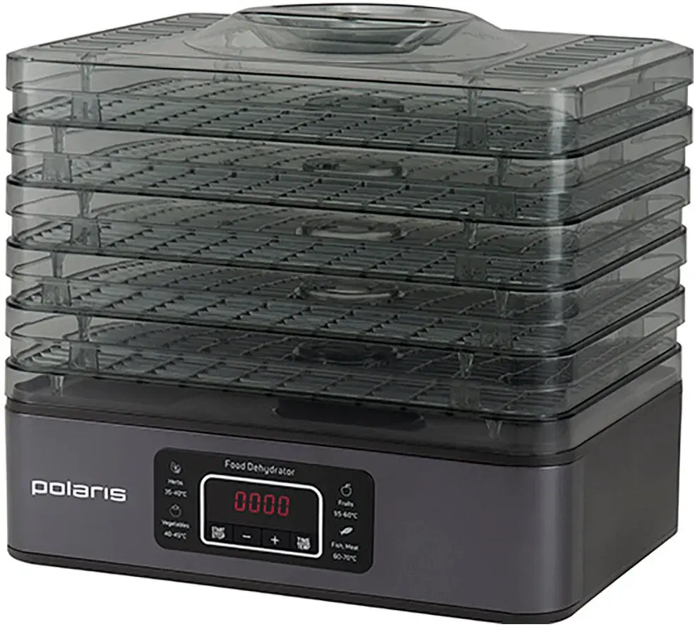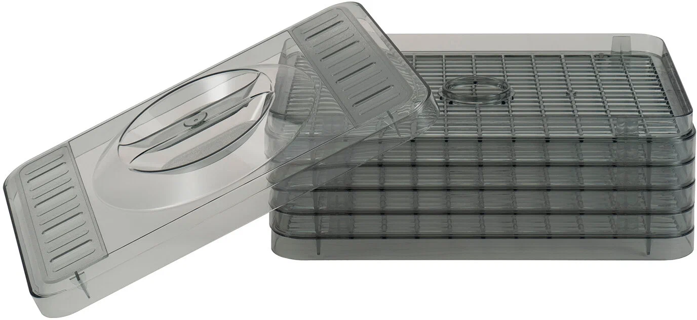 - 5 поддонов с раздельными отсеками позволяет сушить разные продукты одновременно не смешивая вкус.