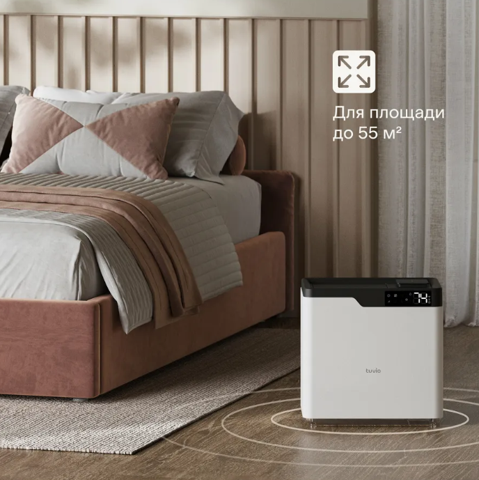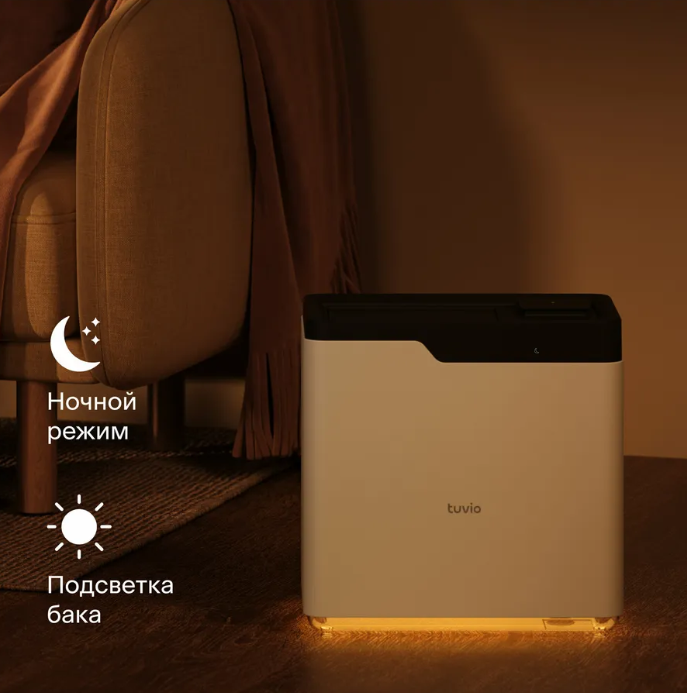 Tuvio TAP01DE — это мойка воздуха с 6-литровым баком и интенсивностью испарения до 650 мл/час. Воду можно доливать прямо в процессе работы устройства — для этого есть удобный верхний залив.