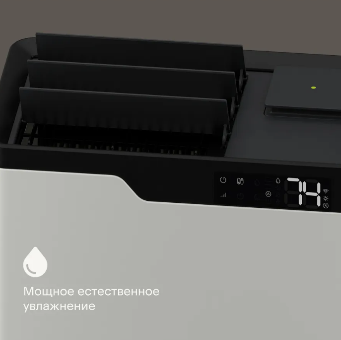 Устройство работает по принципу естественного увлажнения — на специальную губку поступает вода и смачивает ее, а вентилятор внутри прибора создает воздушный поток. Вода испаряется естественно, можно забыть о конденсате на окружающих предметах.