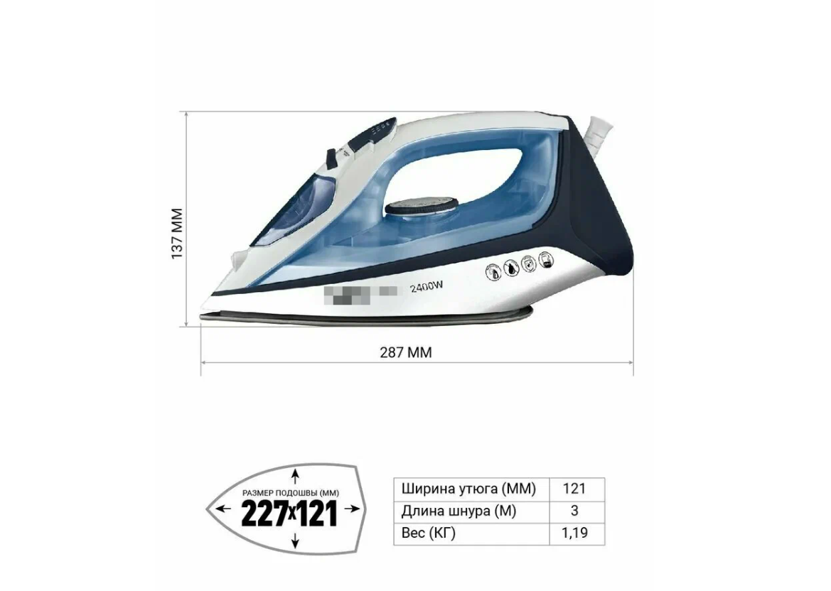 Длина сетевого шнура составляет 3 метра, что обеспечивает свободу движения при глажении. Мощность утюга составляет 2400 Вт, что гарантирует быстрое и эффективное разглаживание складок.