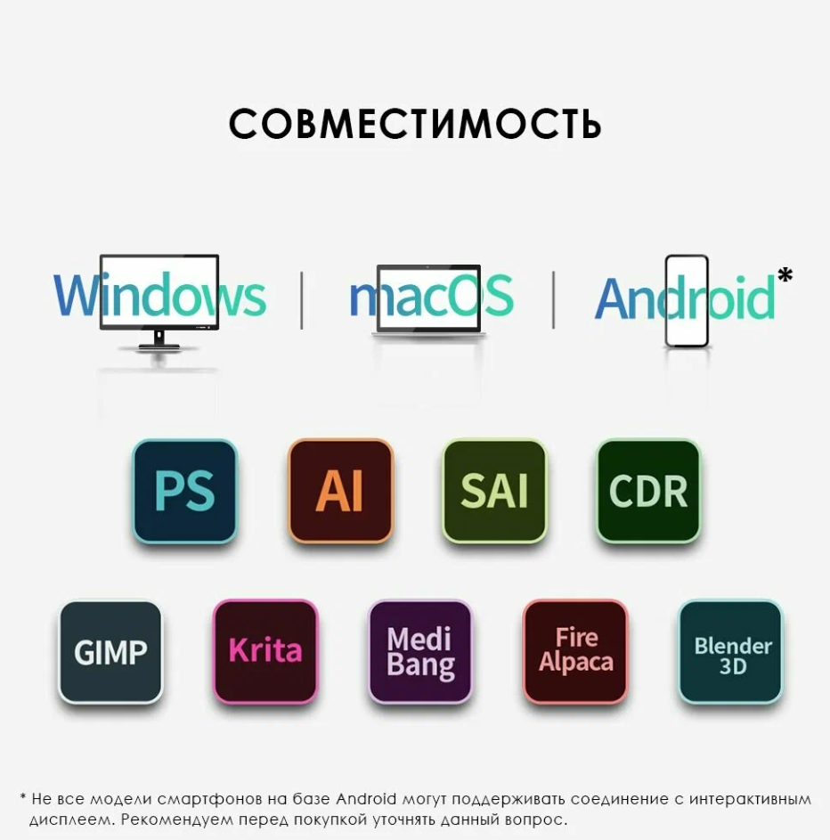 Интерактивный дисплей: 1 шт. Перо: 1 шт. Пенал для пера: 1 шт. Наконечники для пера: 8 шт. Складная подставка: 1 шт. Кабель USB Type -C to USB-C: 1 шт. Кабель USB Type -C to USB-A: 1 шт. Кабель 3-в-1: 1 шт. Кабель-удлинитель USB Type-A: 1 шт. Перчатка для рисования: 1 шт. Чистящая салфетка: 1 шт. Руководство для быстрого запуска: 1 шт.